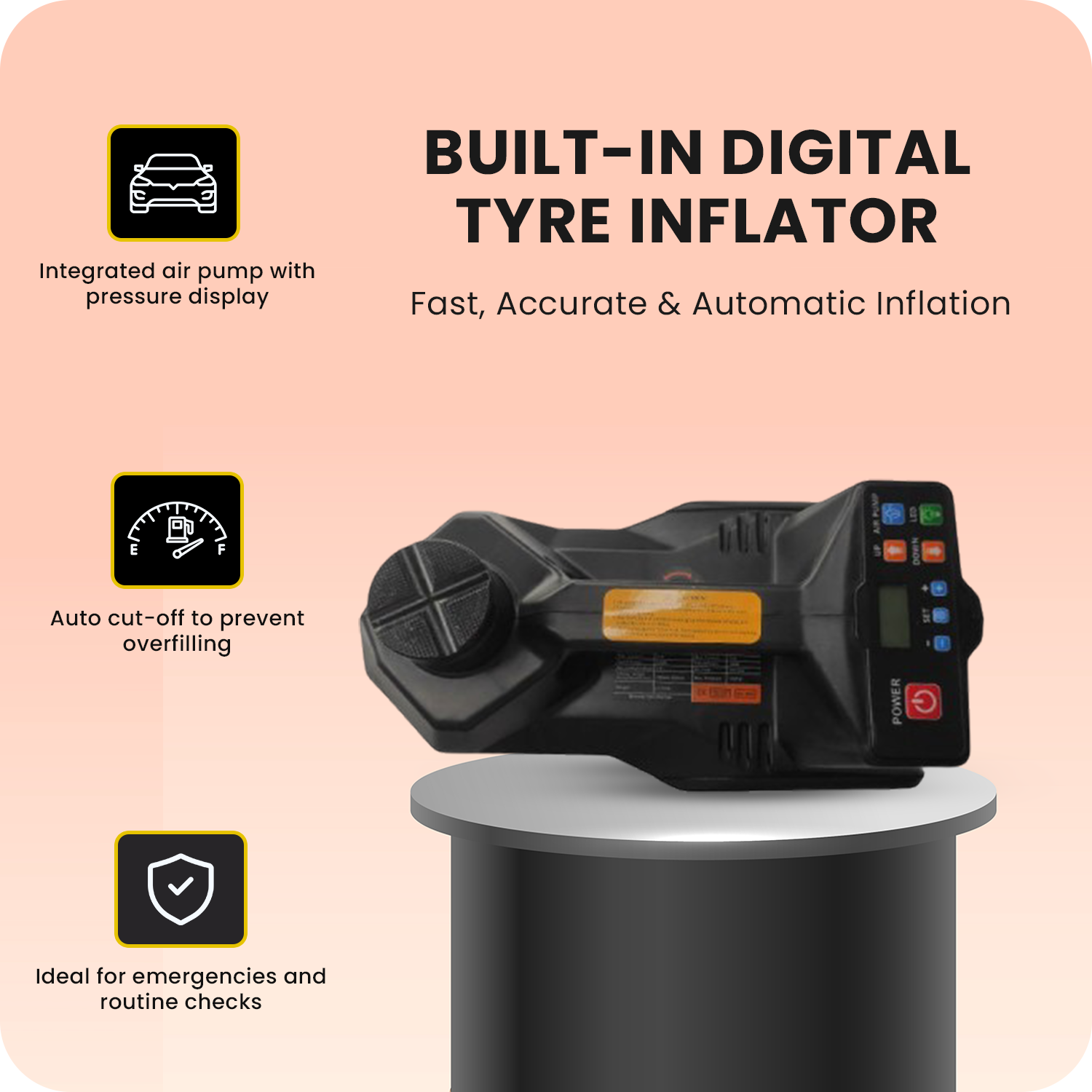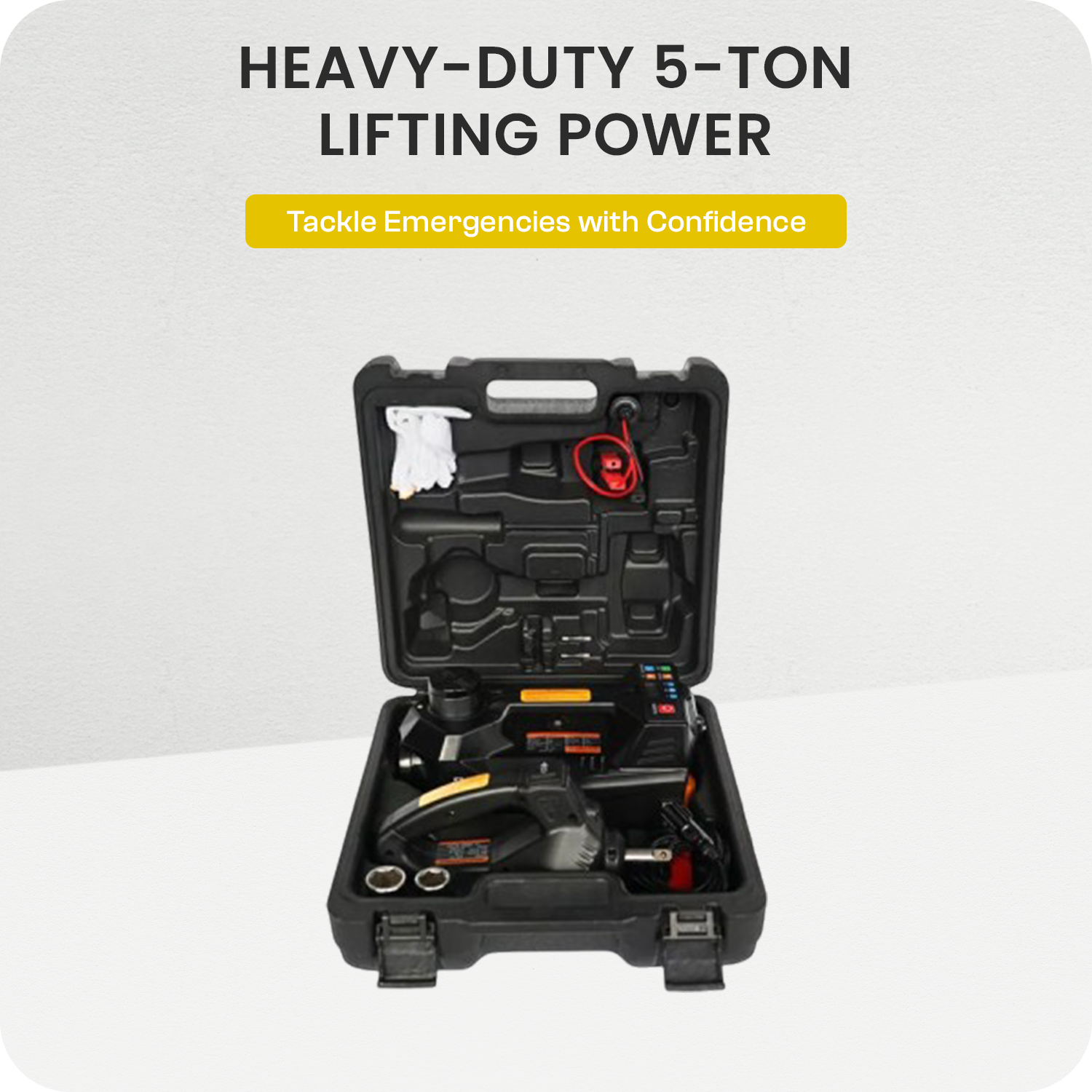 Operates through a standard 12V car socket or battery clip. Compact all-in-one toolkit, including jack, inflator, and wrench, neatly stored in a sturdy carry case for easy transport and roadside readiness.