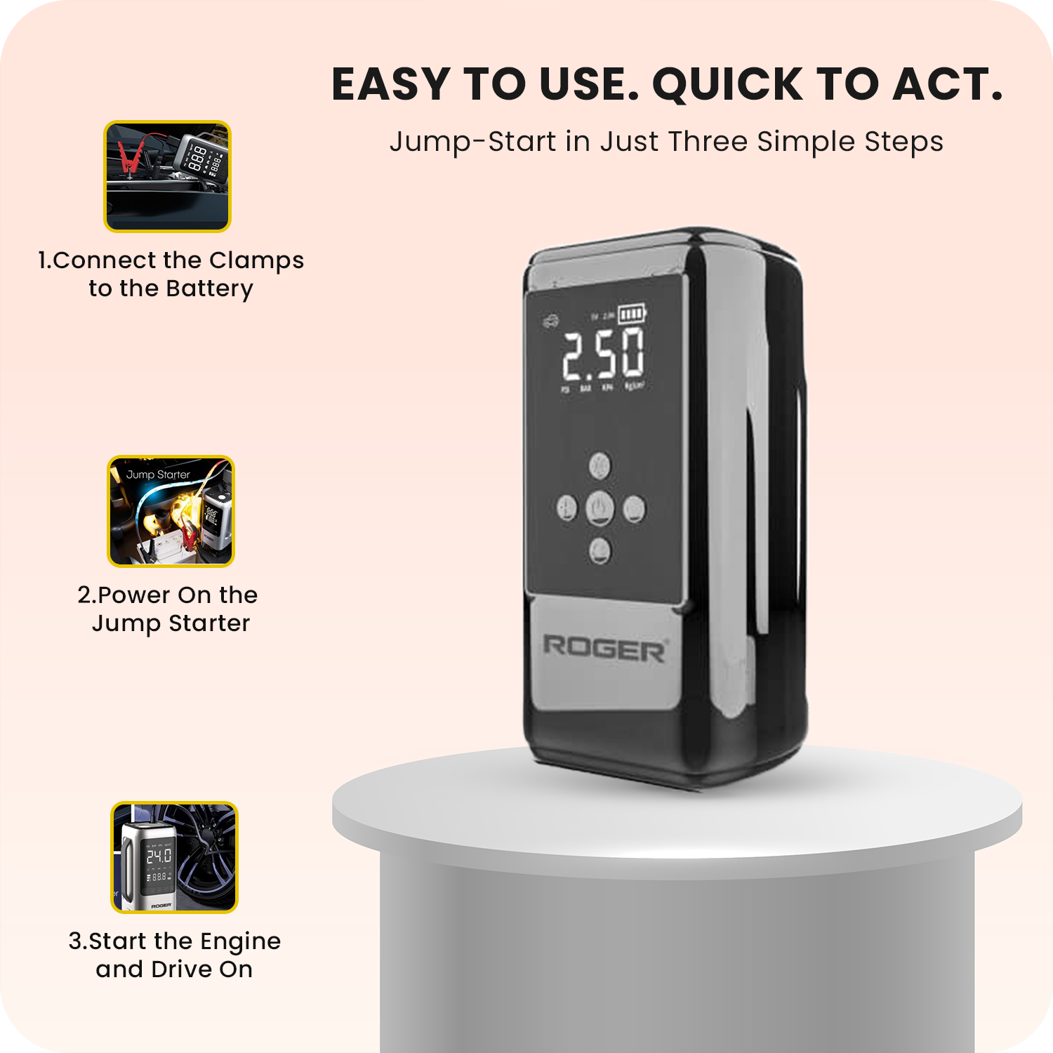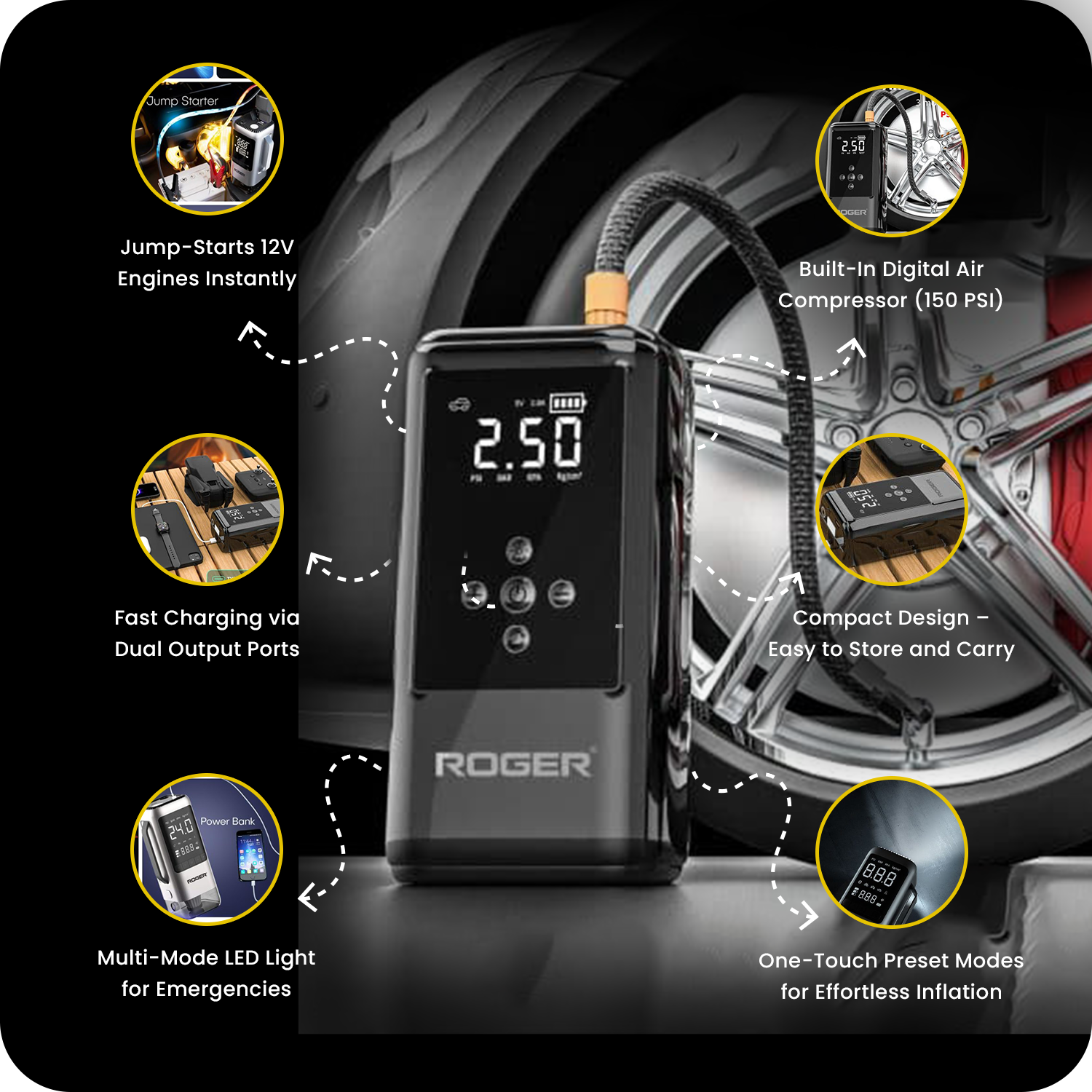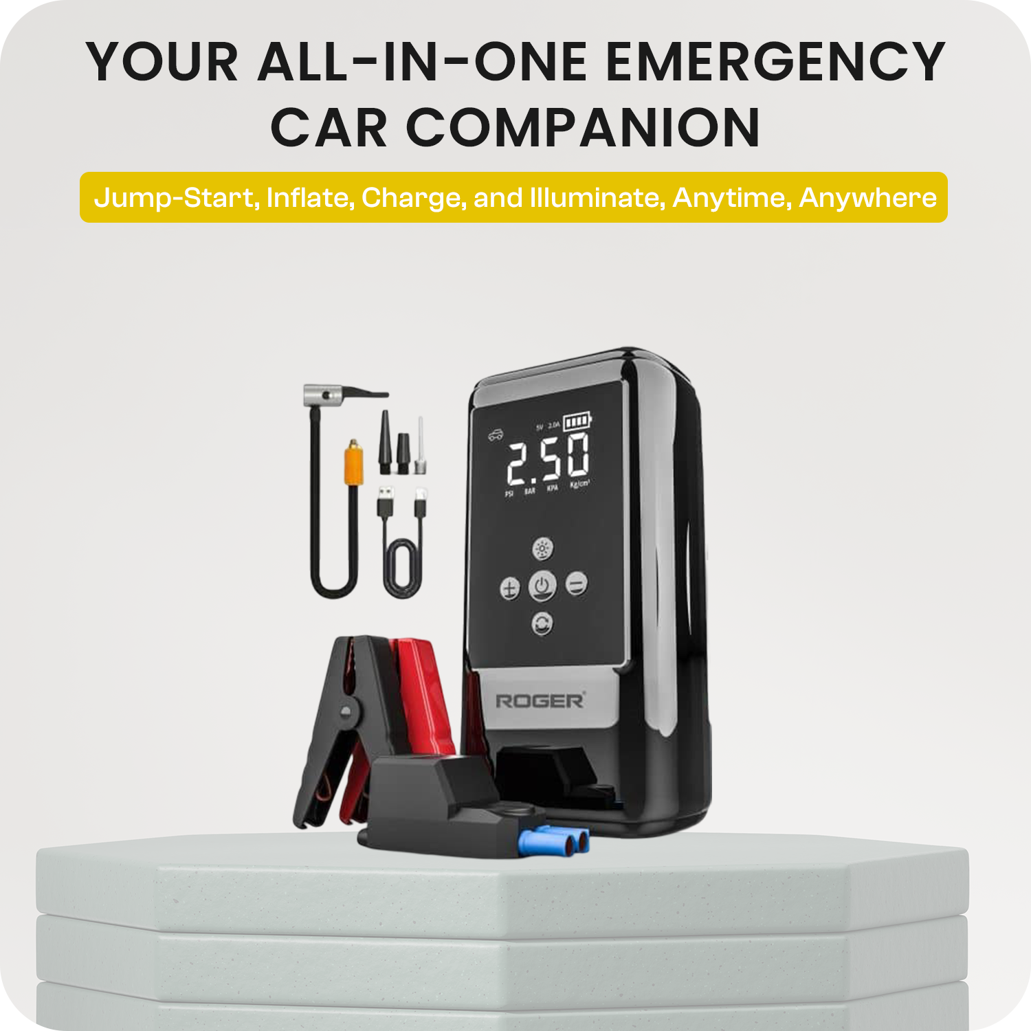The Roger 2-In-1 Multifunctional Jump Starter is designed to be your go-to device in emergencies. Whether you're stuck with a dead battery, a flat tyre, or no phone charge, this compact powerhouse delivers instant support on the road.