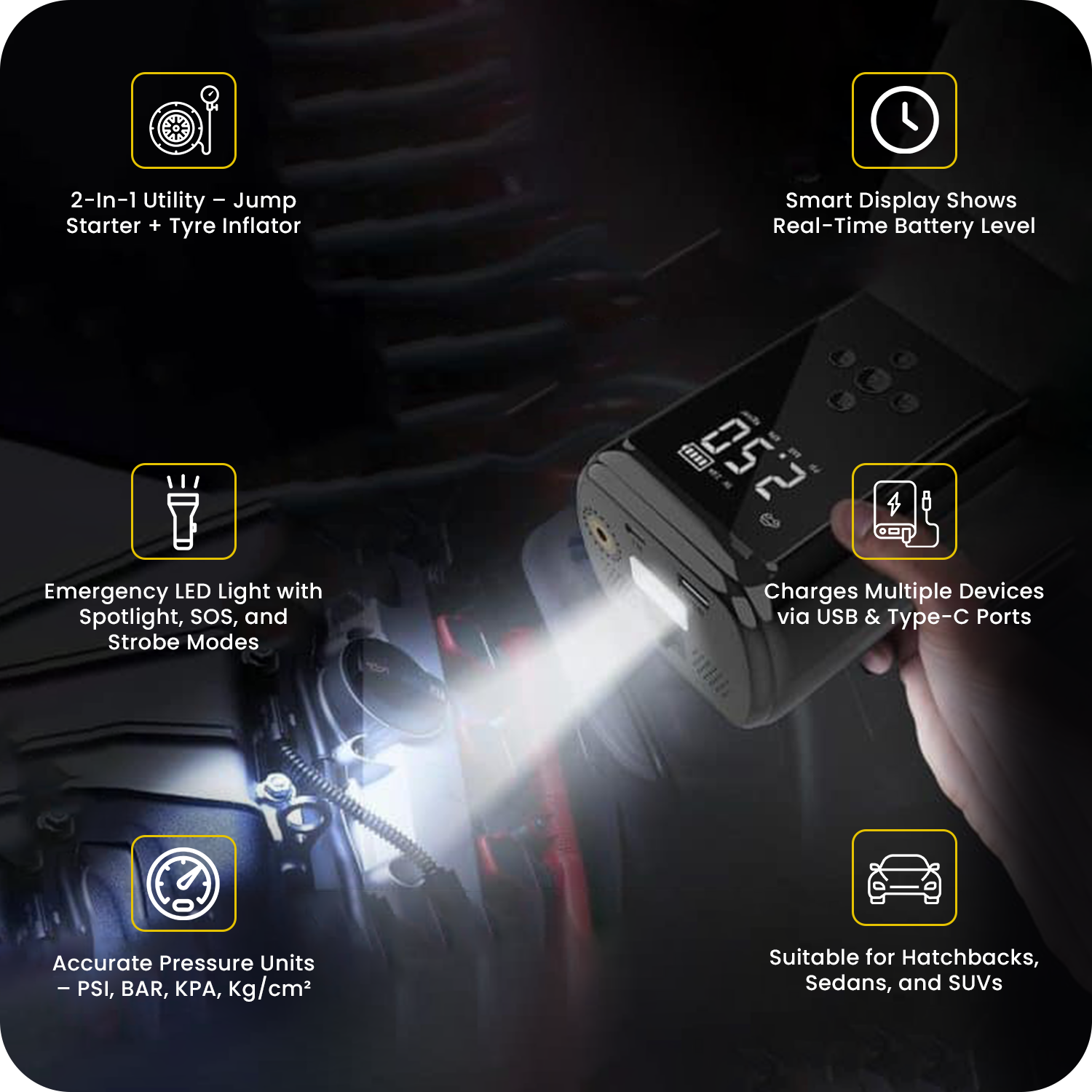 - 2-In-1 Utility – Jump Starter + Tyre Inflator
