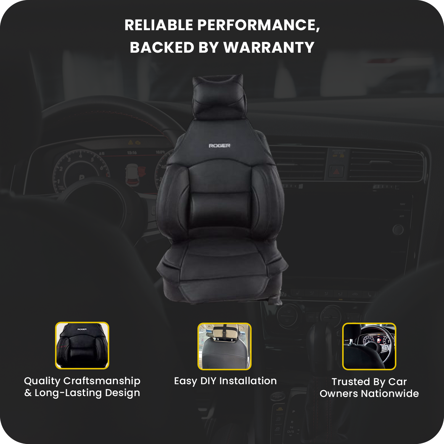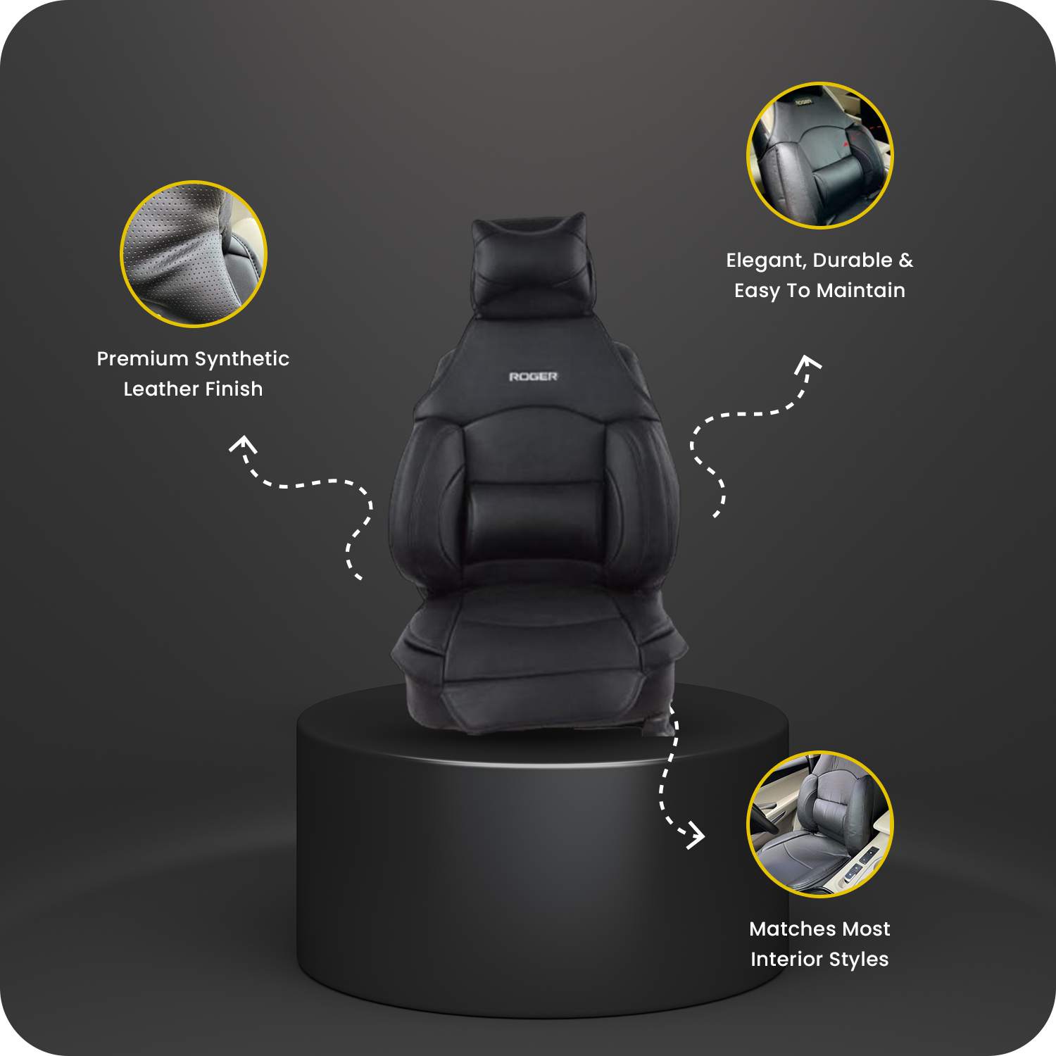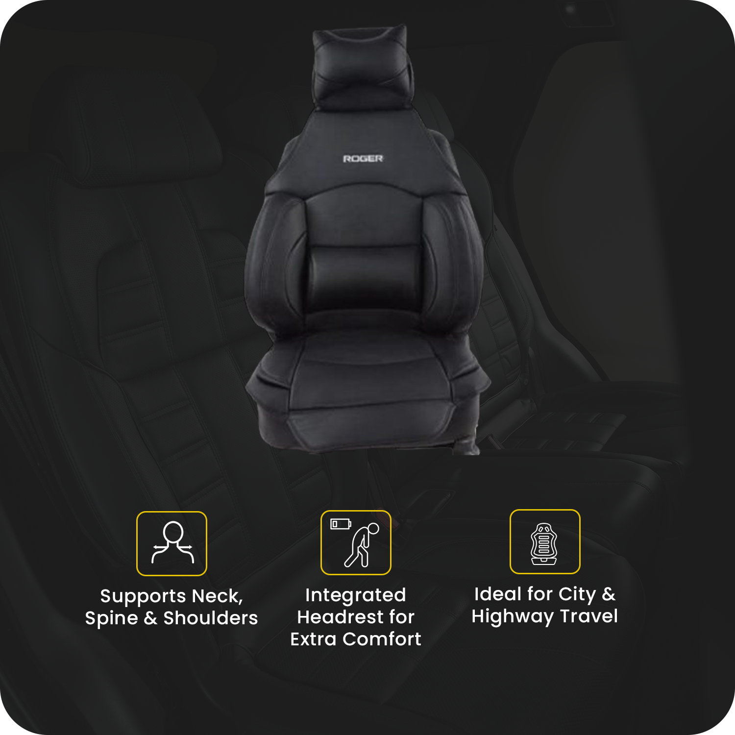 Crafted from high-quality synthetic leather, the ROGER Cushport Seat Cover provides comprehensive support to the neck, shoulders, back, lower spine, and thighs, making long drives more comfortable and less tiring.