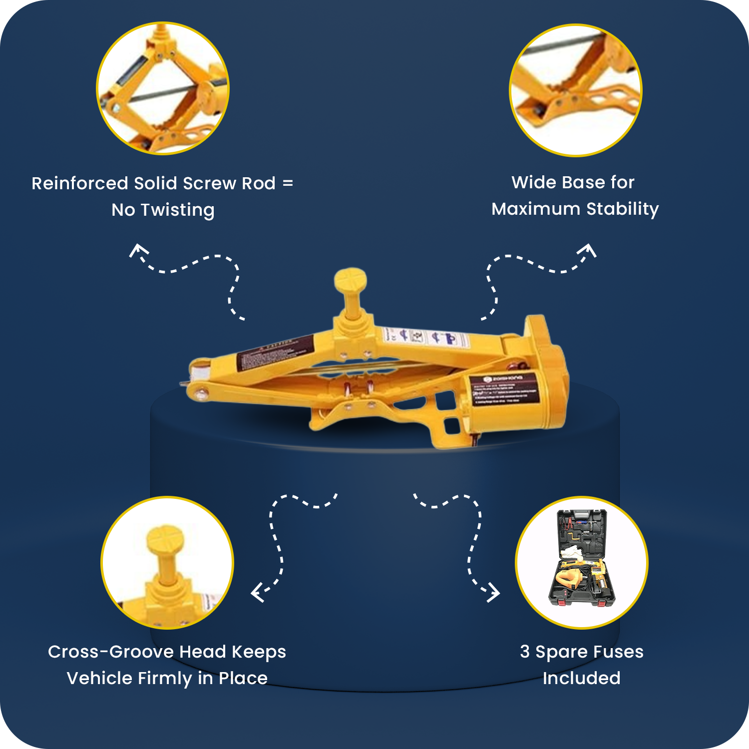 Crafted from heavy-duty steel, the jack features a reinforced solid screw rod to prevent bending or twisting under pressure. A cross-groove head and wide steel base ensure a firm grip and stable lift, while the 12V motor guarantees smooth, quick performance.