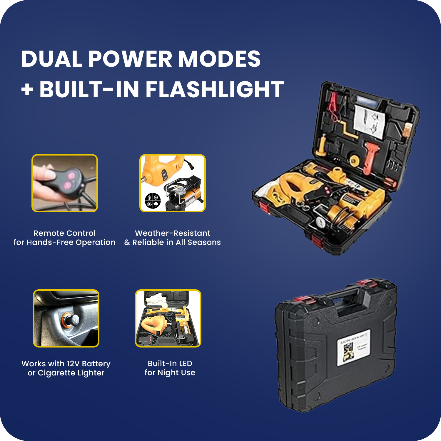 Powered via car battery or cigarette lighter, with three spare fuses and a built-in LED flashlight on the remote for nighttime visibility. All components are stored in a rugged multi-functional box with a luminous red emergency warning triangle—keeping your tools organized and your roadside presence visible.