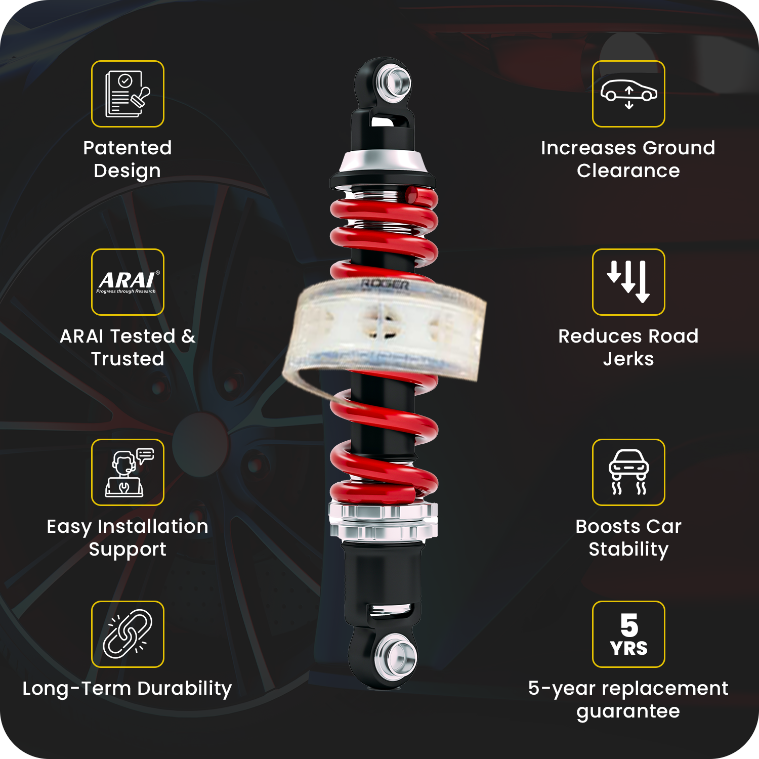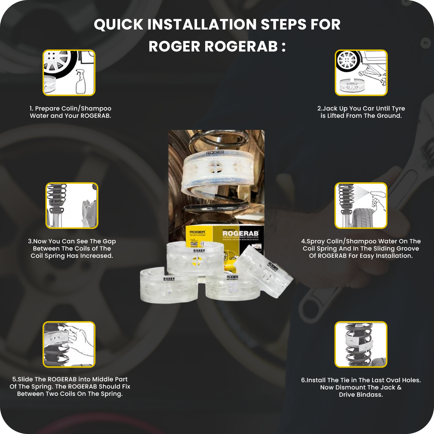 ROGERAB makes driving over potholes, bumps, and rough roads smooth and safe. It restores car height, improves stability, reduces jerks, and enhances braking. Easy to install in 20 minutes, it increases tyre and suspension life. Backed by a 5-year warranty, ROGERAB is ideal for Indian road conditions.