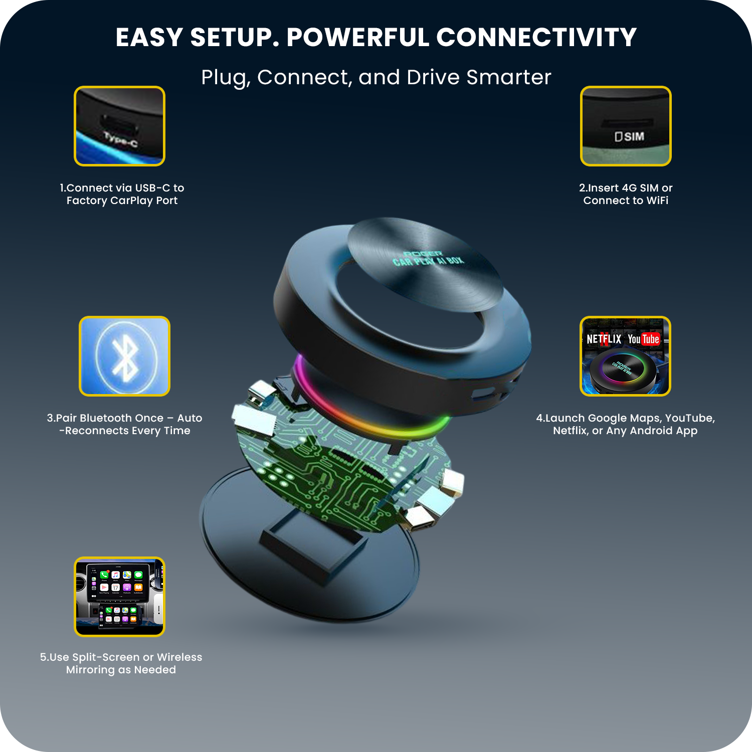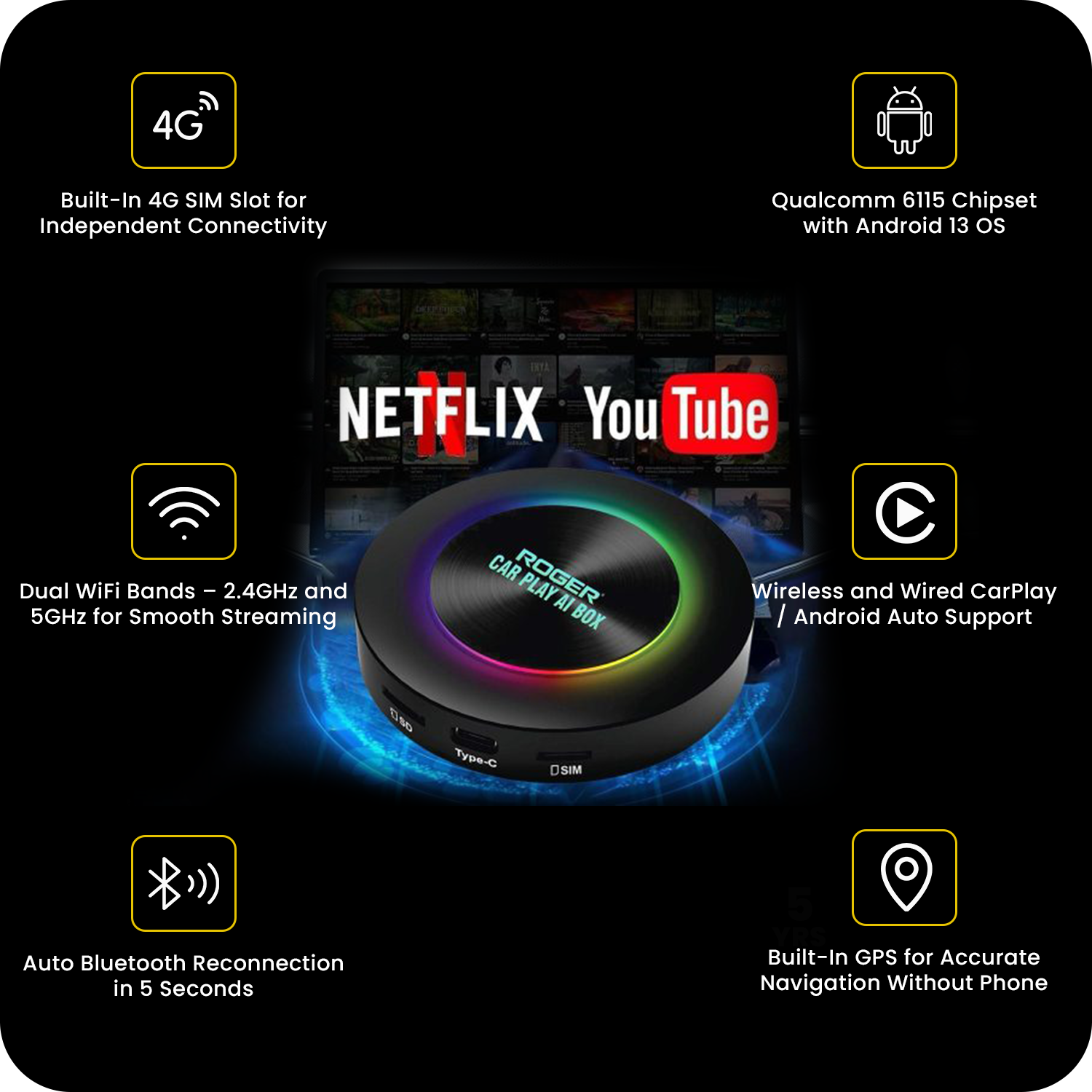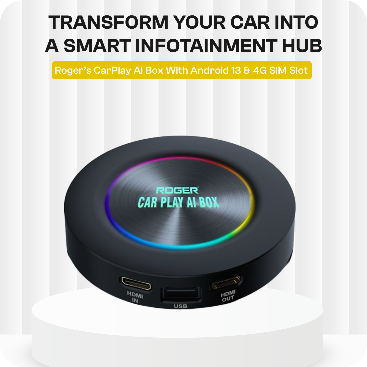Roger’s CarPlay AI Box with 4G SIM Slot | Android 13 | 4GB+64GB | Qualcomm | Stream YouTube, Netflix, Google Maps | Wireless CarPlay & Android Auto | 4K Video | Dual Bluetooth | GPS | 2-Year Warranty