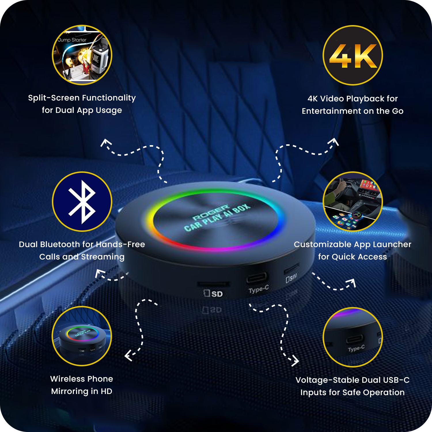 Take full control of your driving experience. With wireless CarPlay and Android Auto, Roger’s CarPlay AI Box brings Google Maps, YouTube, Netflix, and more directly to your dashboard—no phone needed.