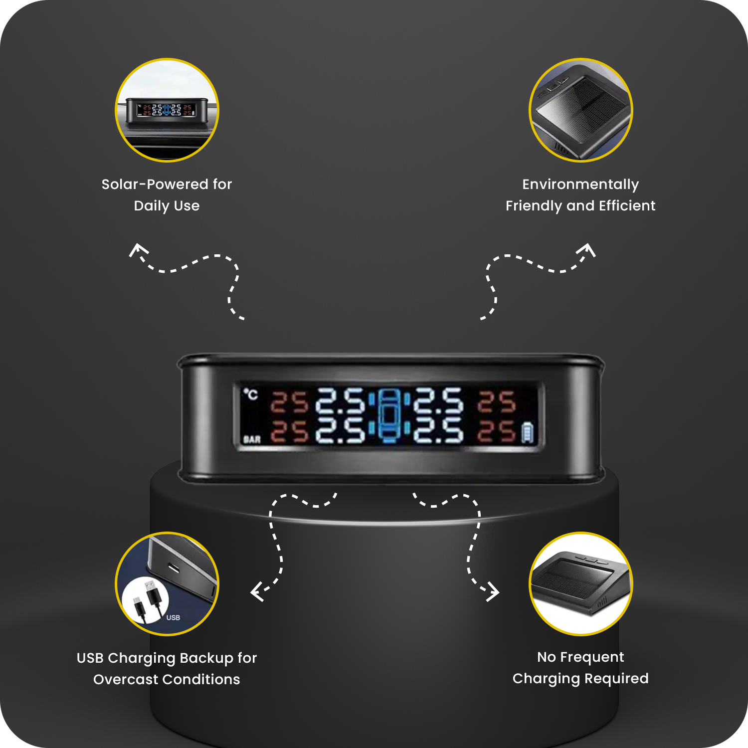 Powered primarily by solar energy, the TPMS also includes a USB charging port for backup during low-light or cloudy conditions, ensuring uninterrupted monitoring at all times.