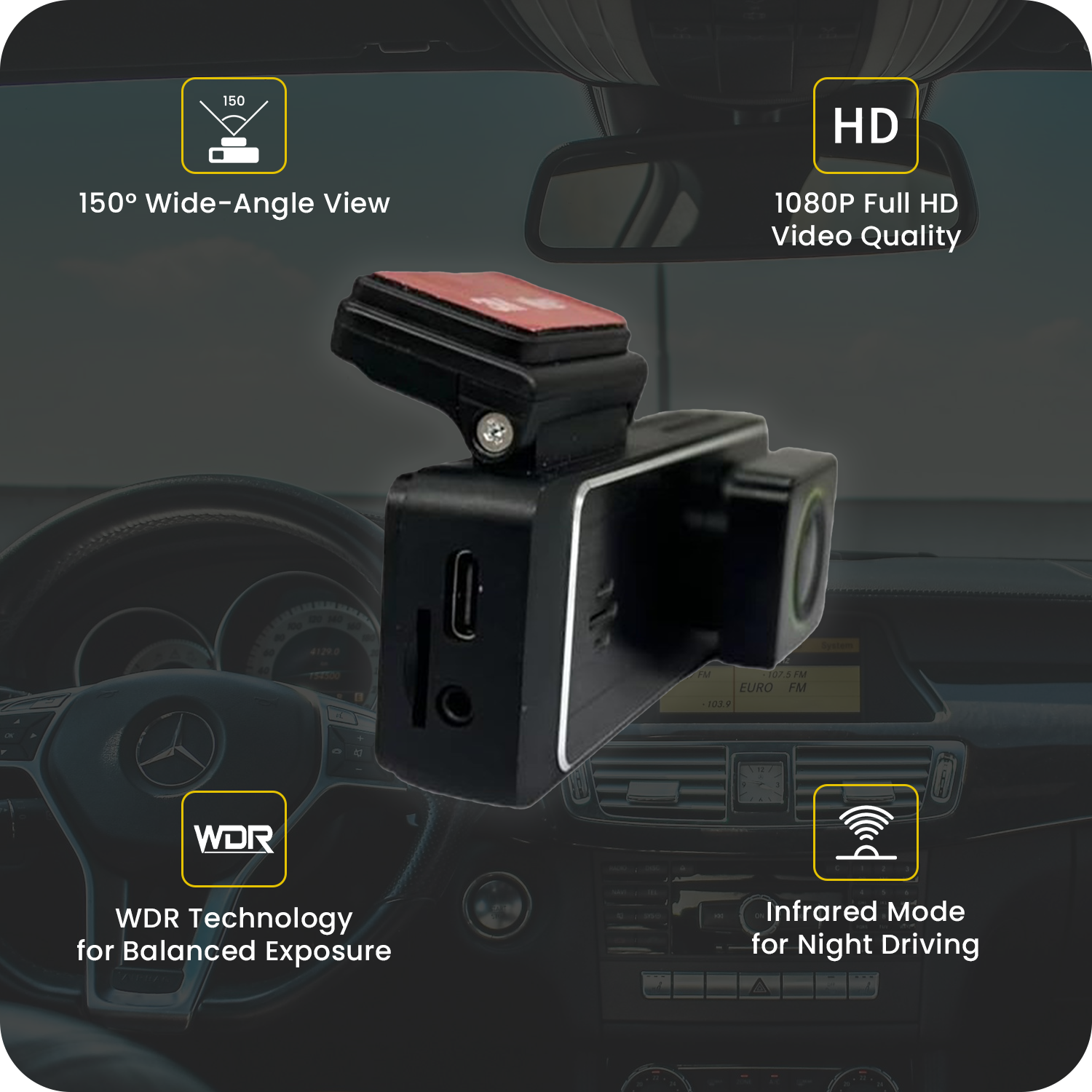 Equipped with a 150° wide-angle lens that captures clear 1080P Full HD footage. The broad field of view ensures maximum road coverage for enhanced safety and visibility.