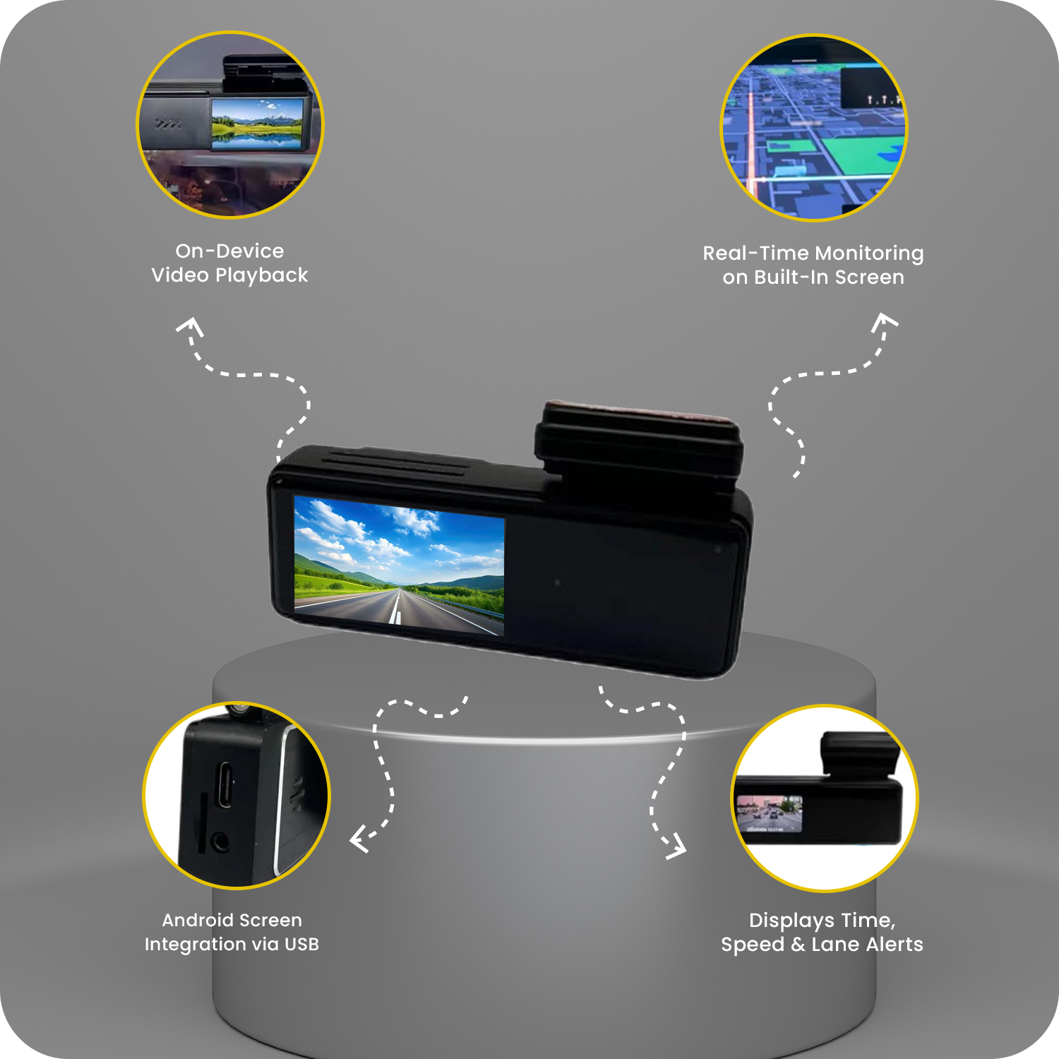 Includes a built-in 1-inch screen for on-device viewing and WiFi connectivity for smartphone pairing. Can also connect to Android screens via USB to display live data such as speed, time, collision alerts, and lane departure warnings.
